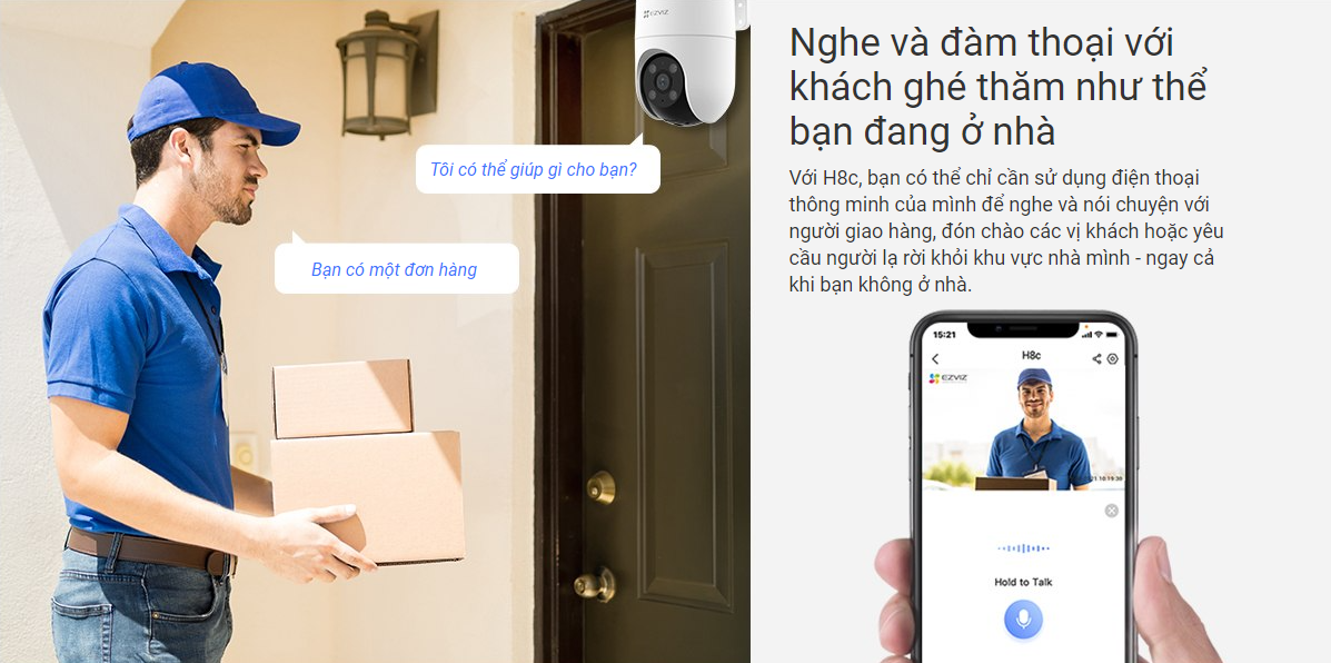Với H8c, bạn có thể chỉ cần sử dụng điện thoại thông minh của mình để nghe và nói chuyện với người giao hàng, đón chào các vị khách hoặc yêu cầu người lạ rời khỏi khu vực nhà mình – ngay cả khi bạn không ở nhà.